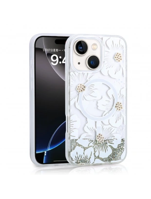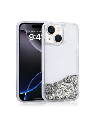 Apple iPhone 14 Kılıf Sıvılı Simli Baskılı Şeffaf Arka Yüzey Zore Mossa Silikon Kapak